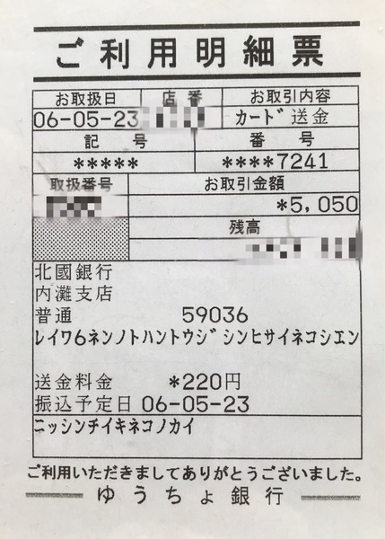 4月と5月の譲渡会でいただきました全額(5,050円)を「令和6年能登半島地震被災猫支援金」さま宛に送金いたしました。