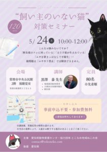 とこなめ地域ねこの会さんが、5月にセミナーを開催されます。 講師は、地域猫発案者の黒澤先生! 会場は常滑市ですが、お近くにお住まいで猫トラブルにお悩みの方、解決のヒントが見つかると思います。 ぜひお運びください! 日時: […]