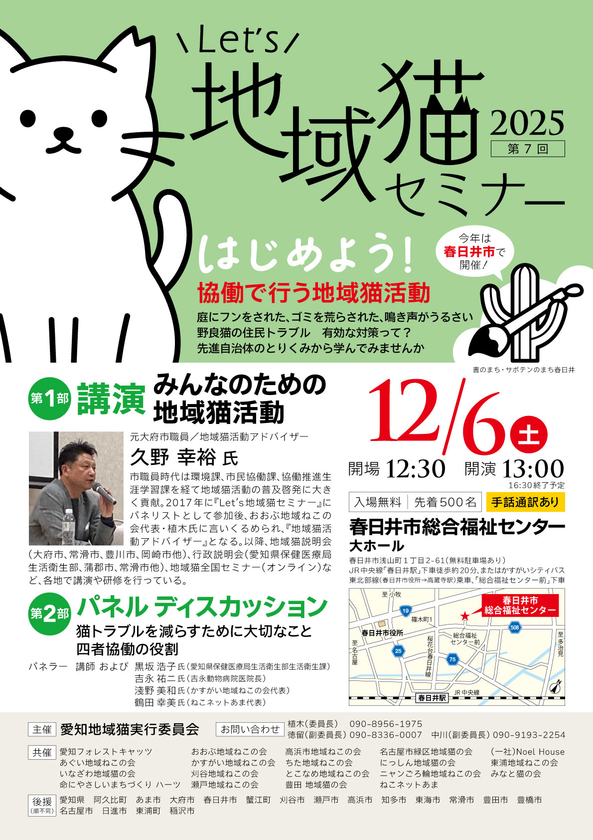 猫被害でお困りの方、良い解決方法をお探しの自治会の方、ぜひお越しください。また、行政の方向けの講演もございます(要事前申込)。