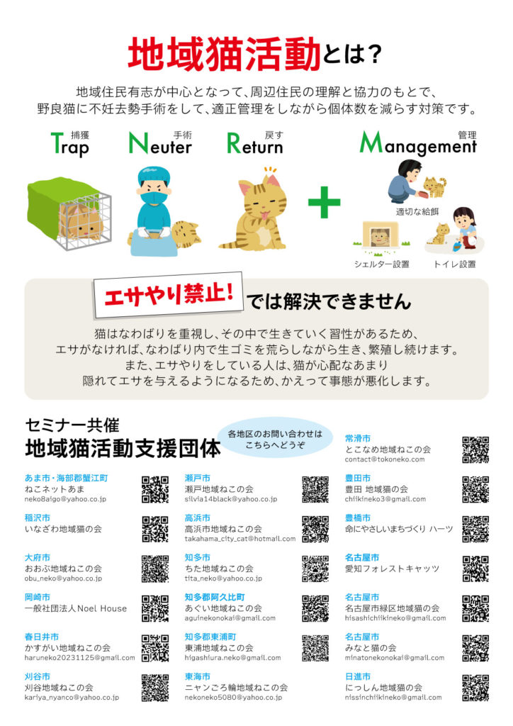 あぐい地域ねこの会、命にやさしいまちづくり ハーツ、おおぶ地域ねこの会、かすがい地域ねこの会、刈谷地域ねこの会、こうなん地域猫の会、瀬戸地域ねこの会、高浜市地域ねこの会、ちた地域ねこの会、とこなめ地域ねこの会、豊田 地域猫の会、名古屋市緑区地域猫の会、にっしん地域猫の会、ニャンごろ輪地域ねこの会、ニャンとかしまい豊川、ねこネットあま、東浦地域ねこの会、前山ネコの会、みなと猫の会【後援】