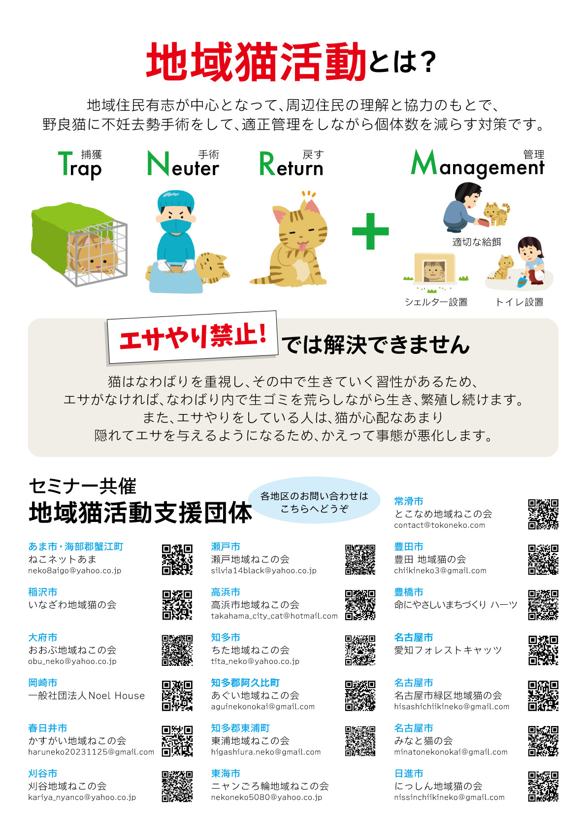 「猫トラブルをなんとかしたいが、どこからはじめてよいのかわからない」「個人でのら猫の手術をしているが、周囲や行政の理解を得るのが難しい」などなど、猫にまつわるアレコレでお悩みの方、ぜひお越しください!